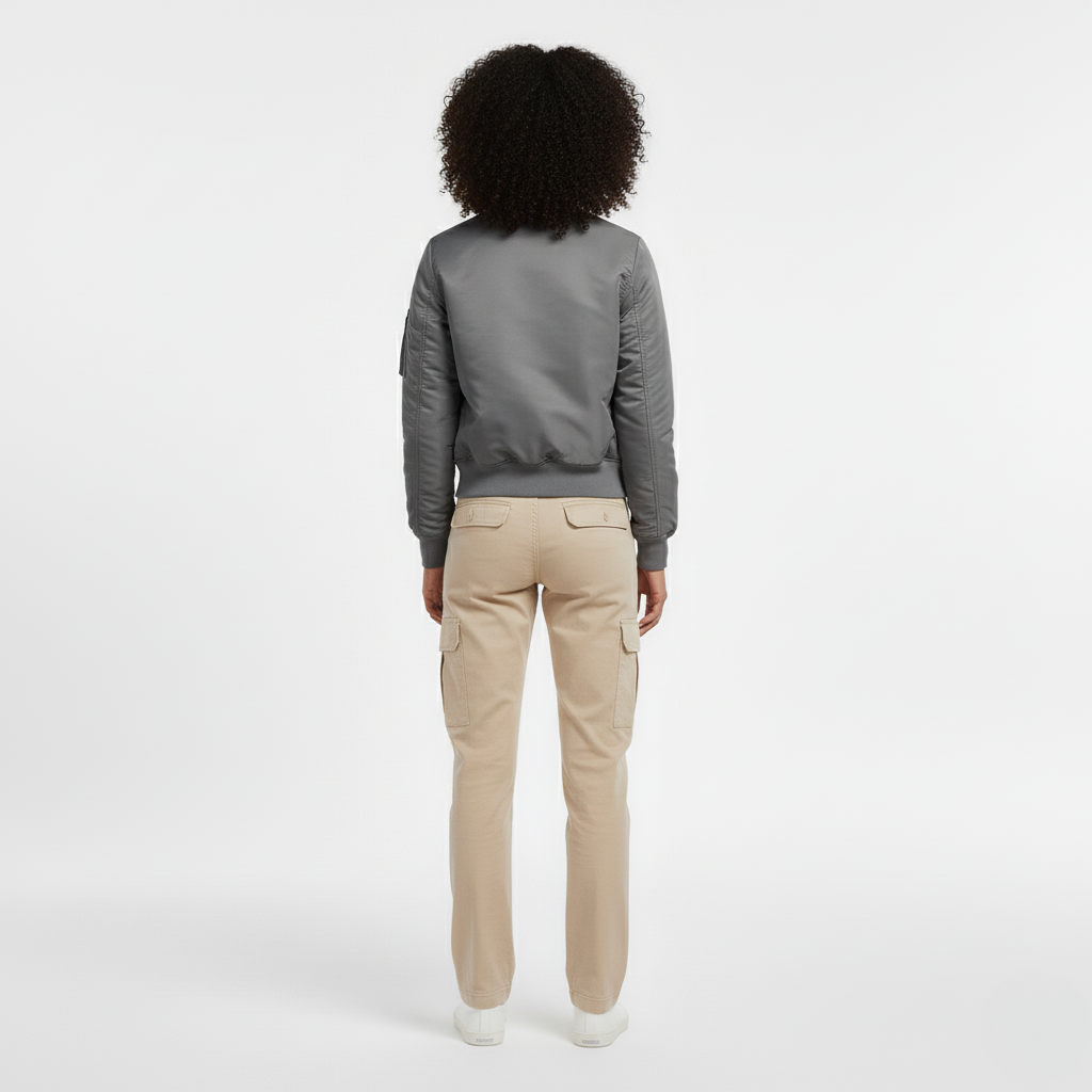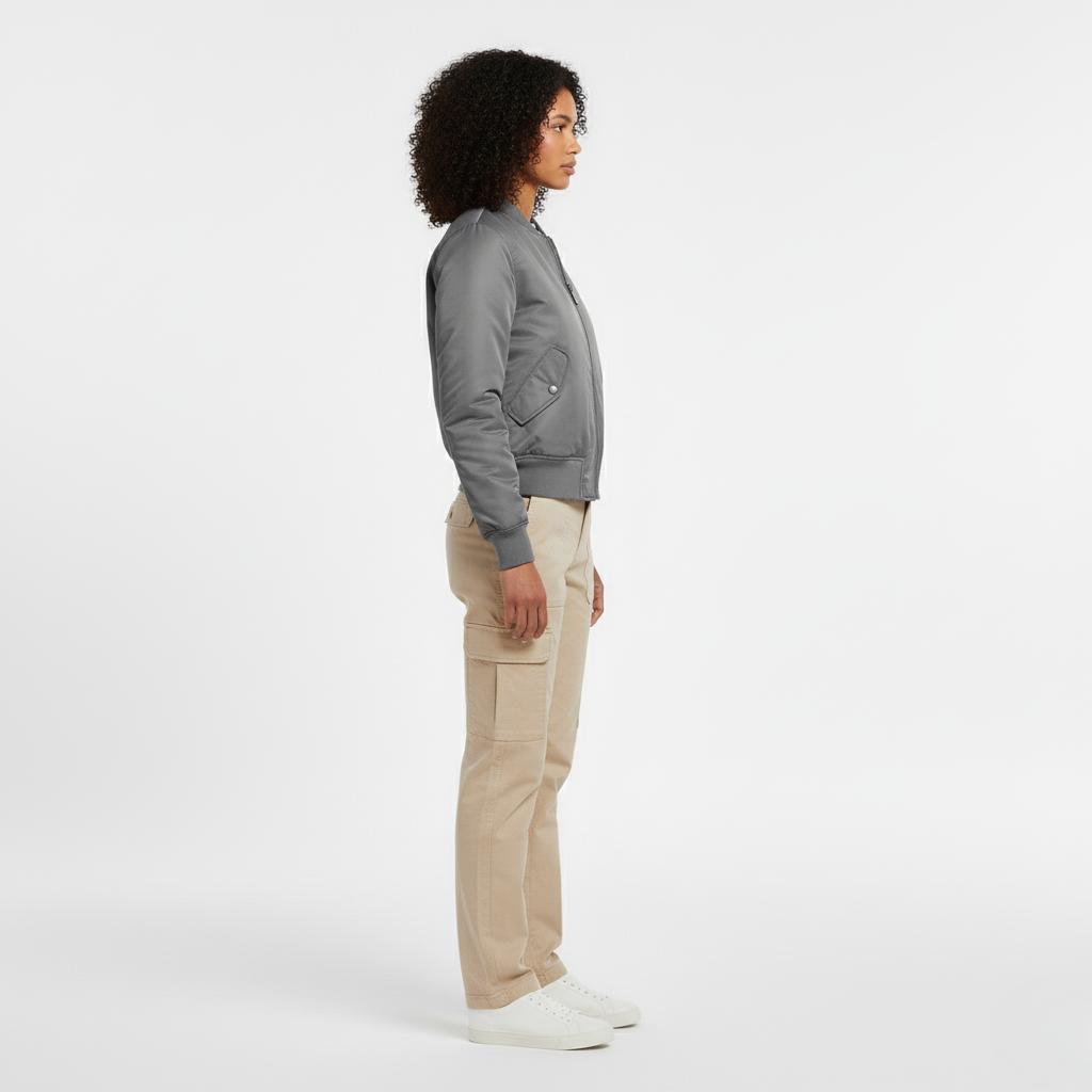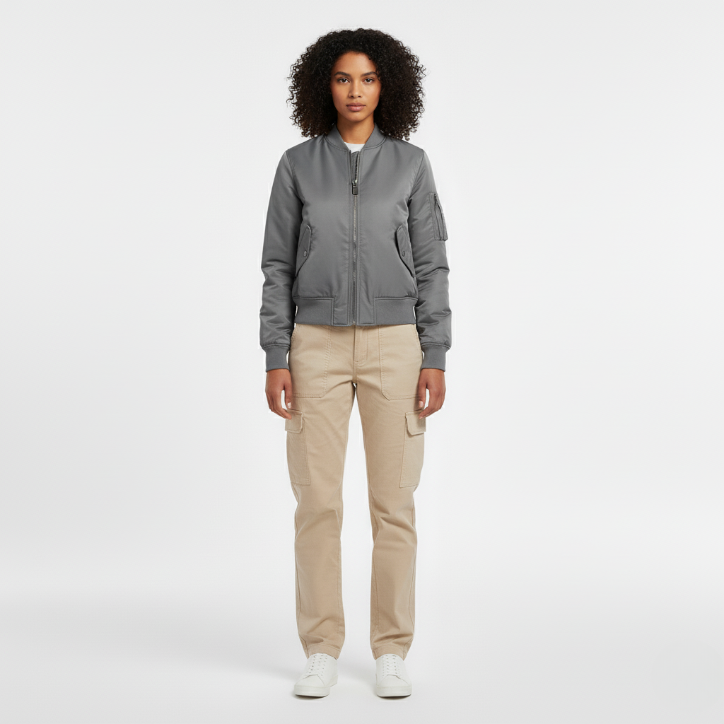 Træd ind i moderne minimalisme med denne grå dame-bomberjakke og beige cargobukser, designet til komfort, alsidighed og tidløs coolness. Den slanke grå bomberjakke tilføjer en markant, struktureret silhuet, mens de afslappede beige cargobukser balancerer funktion med et laid-back udtryk. Afsluttet med hvide sneakers fanger dette look essensen af urban streetwear chic—perfekt til byture, weekendærinder eller afslappede møder.