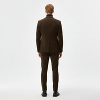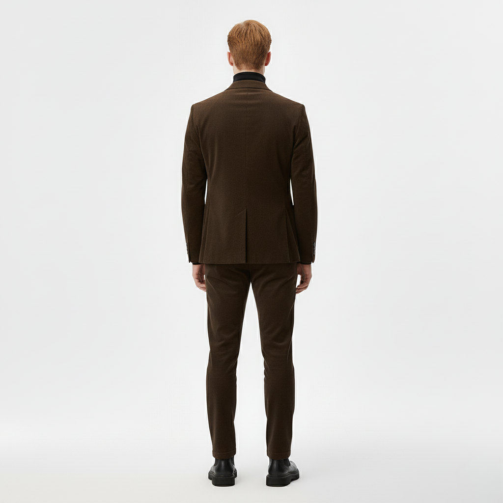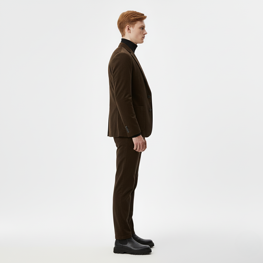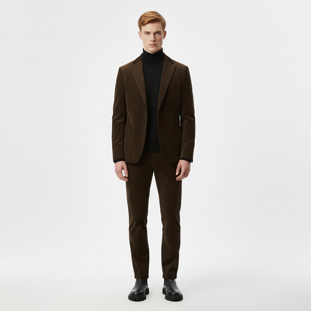 Træd ind i forhøjet enkelhed med denne sofistikerede kombination, bestående af et brunt skræddersyet jakkesæt, sort rullekrave og matchende brune bukser. Den dybe jordfarve kombineret med et skarpt mørkt lag skaber et stærkt, moderne look, ideelt til arbejde, aftener ude eller enhver anledning, der kræver selvsikker, moderne menswear-stil.