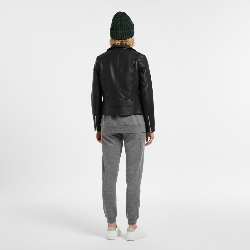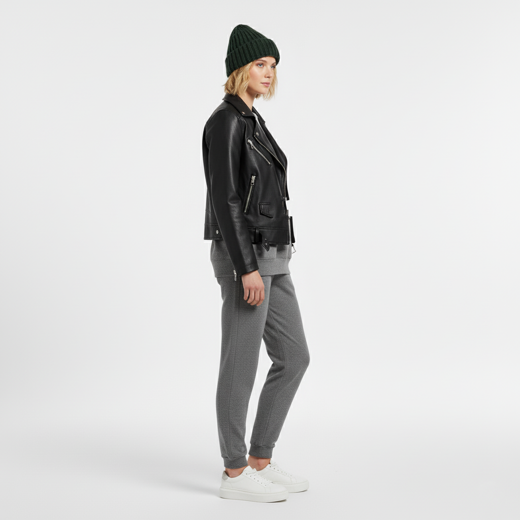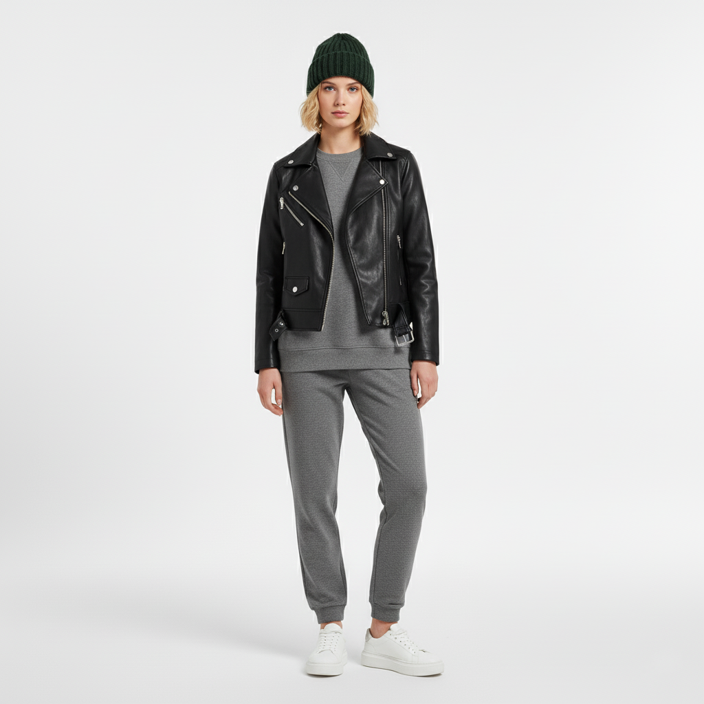 Hold en afslappet cool stil i denne sorte læder bikerjakke, kombineret med et gråt joggersæt og en grøn ribstrikket beanie for et look, der er lige dele afslappet og raffineret. Perfekt til byture eller weekendudflugter—dette outfit kombinerer moderne streetwear med premium komfort. Afsluttet med hvite sneakers for en ren, minimalistisk finish, er det dit go-to look for selvtillid på farten.