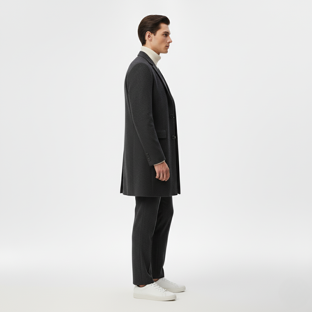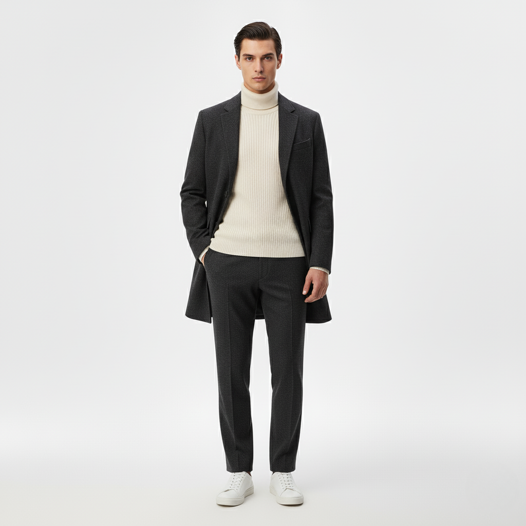 Løft din hverdagsgarderobe med denne sofistikerede kombination, bestående af en mørkegrå frakke, cremefarvet rullekravesweater og mørkegrå skræddersyede bukser. Kontrasten mellem blød strik og skarp tailoring skaber et rent og moderne look, ideelt til arbejde, aftener ude og poleret casual dressing. Designet til komfort, alsidighed og tidløs herreinspireret æstetik leverer dette outfit ubesværet elegance.