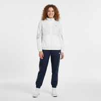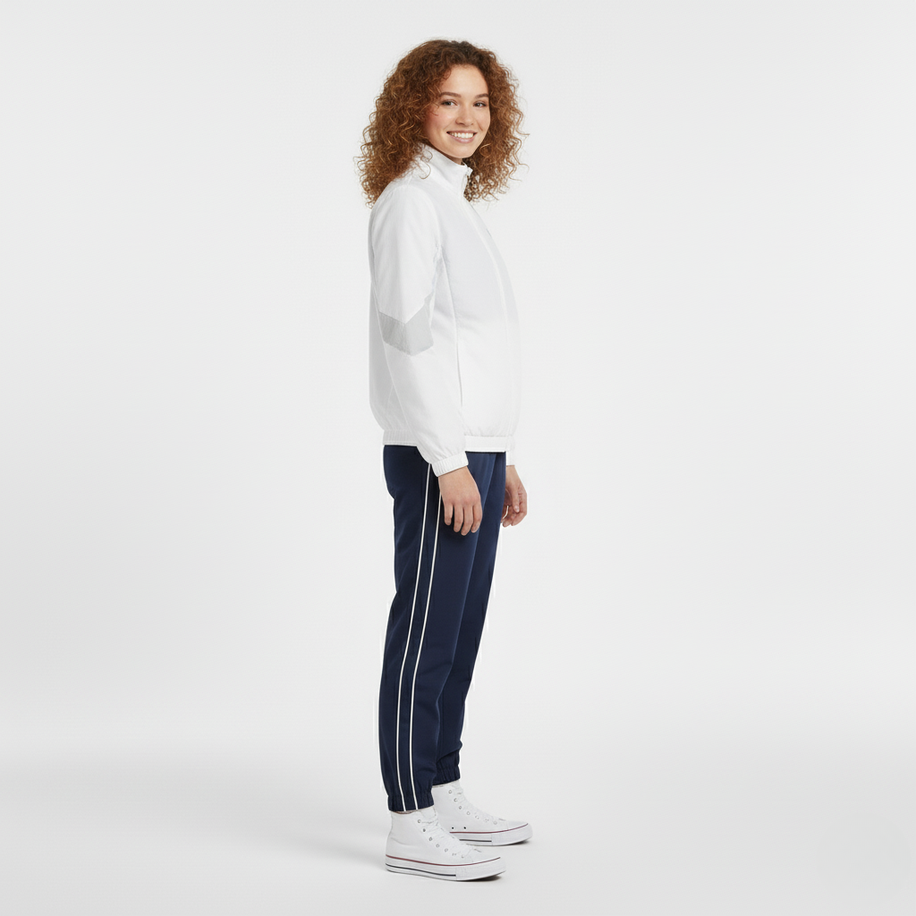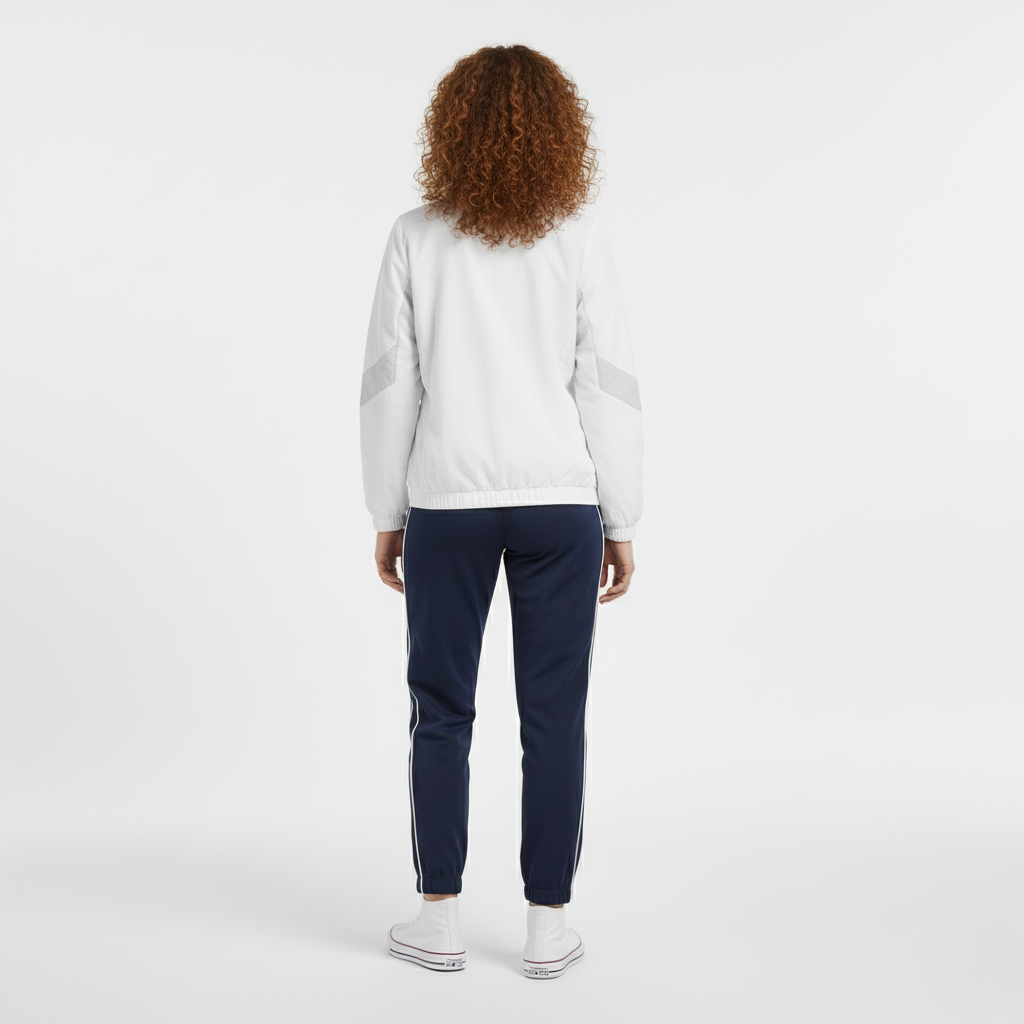 Hold en ubesværet stil med denne hvide dame-trackjakke og marineblå joggers, designet til komfort, bevægelsesfrihed og street-ready flair. Den skarpe hvide zip-up jakke giver en ren, sporty silhuet, mens de marineblå joggers med sidestriber tilfører et retro-cool twist. Afsluttet med hvide high-top sneakers skifter dette look sømløst fra træning til weekend og kombinerer atletisk performance med hverdagsvenlig fashion ease.